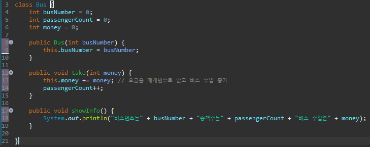 멤버변수 : 버스번호(busNumber), 승객수(passengerCount), 버스 수입(money)