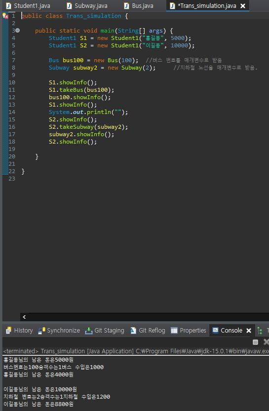 [JAVA] 문제 4-4 학생이 버스나 지하철을 타고 학교에 가는 것을 객체 지향 프로그램으로 구현 본문