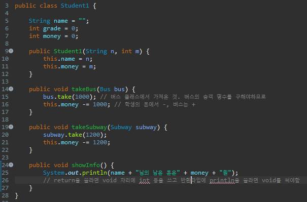 this.money -= 1000; // 학생의 돈에서 -, 버스는 +