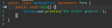 overriding된 각 roll() 메소드에서 회사의 이름 타이어를 출력한다.