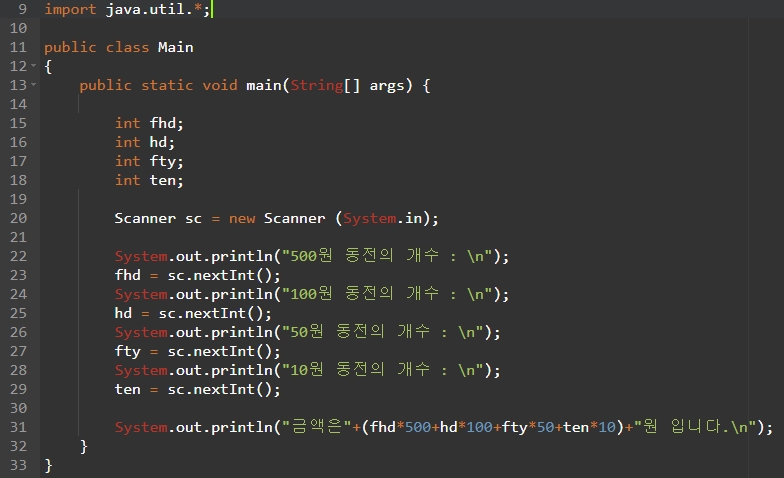 System.out.println("금액은"+(fhd*500+hd*100+fty*50+ten*10)+"원 입니다.\n");