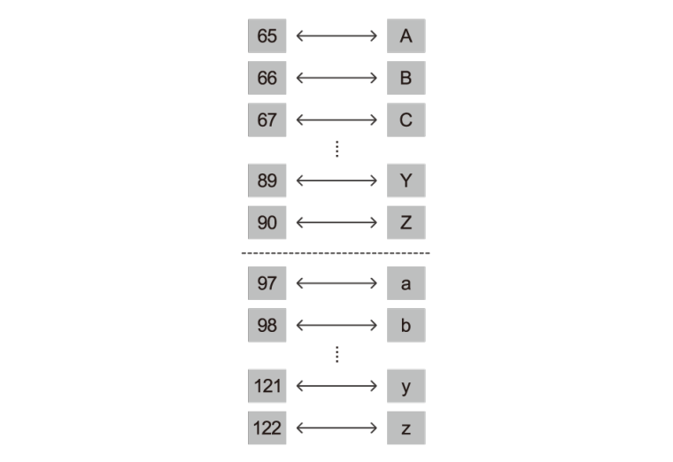 컴퓨터가 데이터에 대해 수행하는 작업으로, 숫자가 아닌 문자나 다른 것들을 나타내기 위해 하는 일 : 숫자를 알파벳 문자에 대응시키는 것.