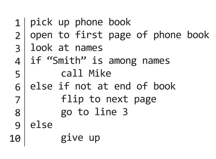 예를 들어, 전화번호부에서 Mike Smith를 찾는 일을 한다고 해보자. 왼쪽 <코드1>의 알고리즘을 살펴보면, 전화번호부를 집어 들고 첫 페이지를 펼친 후 Mike Smith가 그 페이지에 있는지 찾고 없으면 그 다음 페이지에서 찾는다. Mike Smith 를 찾을 때까지 혹은 전화번호부가 끝날 때까지 이것을 반복한다.