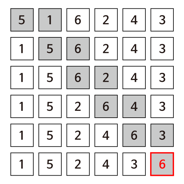 한번 정렬을 하면 1, 5, 2, 4, 3, 6의 순서로 정렬된 것을 확인할 수 있다. 완전히 정렬되지 않은 배열이지만 6은 이미 제 자리에 와 있다. n개의 원소에 대해서 버블 정렬을 한번 수행할 때마다 n번째의 원소가 제 자리를 찾게 된다. 그렇기 때문에 다음 정렬에서는 n-1개의 원소를 정렬해 주면 된다. 이 예시의 경우 다음 정렬은 1, 5, 2, 4, 3 다섯 개의 숫자만 가지고 수행될 것이다.